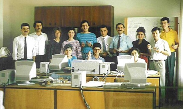 Bilişim Ltd'in TCZB projesi ardından, ikinci işi olan Türkiye Emlak Bankası Proje takımı ile Bankacı dostlarımız, Bilişim Ltd'de Cesur Baransel'in doğum gününe kutluyoruz, 5 Temmuz1987. Ayaktakiler, soldan Fatih Eker (EB), Hikmet Gürbüz (EB), Sekreterimiz Ayşe Tuncer, Ayşe Eser Erkmen (sonra Baransel), Cesur Baransel, ... , AK, Celile H. (Koç-Burroughs), Ali Nural (şimdi Avustralya'da), Cengiz Erbaş (HÜ-BBM'den stajyerimiz), oturanlar: Şerife Şıkdiker (EB), Kayhan İmre, Arife H. (EB Küçükesat Şubesi Md.).