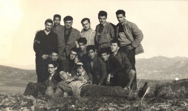 GS Gezi Kolu Baskanı Aydın Köksal (sol başta), bir Fransız öğretmenin kamerasından, onun eşi, iki çocuğu ve coğrafya öğrtemenimiz Ferruhzat Turaç ile (ortada), bir yurt gezisinde Gülek Boğazı'nda, Şubat 1959.