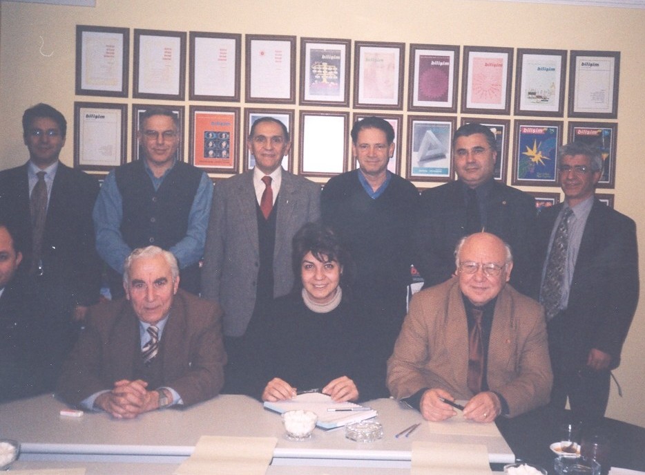 Türkiye Bilişim Derneği'nin bir salonunda, "Bilişim" dergimizin çerçevelenmiş kapaklarının asılı olduğu duvarın önünde, ayaktakiler soldan ikinci Enis Erkel, Aydın Köksal (TBD kurucu bşk), Ersin Töreci (TBD bşk), Ali Arifoğlu (TBD bşk); oturanlar: İlker Tabak (tam gözükmüyor), N. Kaya Kılan (TBD bşk), Hülya Küçükaras (HÜ-Bs.Müh.-1982), Necdet Kesmez ağabeyimizle bir arada.