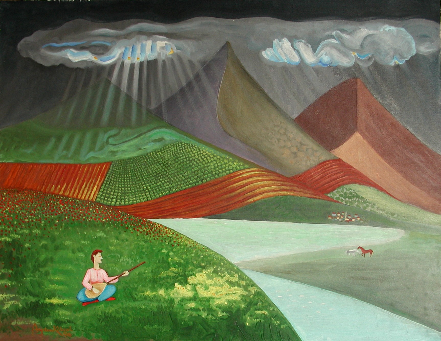 Sevgi Yağan O Güzel Ülke, 1993, tuval üzerine yağlıboya, 70 x 90 cm. (Evet’in çınladığı o güzel ülke, Dante; Karakuş Dağları’ndan Yunus’a saygı