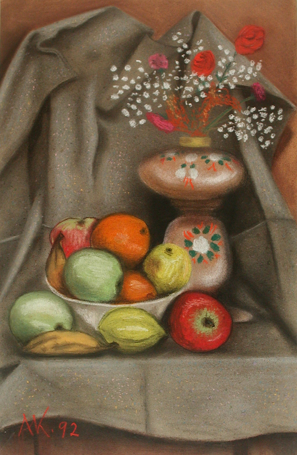 Meyveler ve Porselen Vazoda Kuru Çiçekler, Pastel, 1992, 32x50 cm